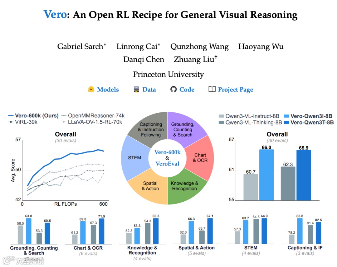 适用于通用视觉推理的强化学习(RL)框架Vero正式开源。该框架由普林斯顿大学刘壮团队主导,陈丹琦参与研发,其构建的视觉推理器在30余项测试中达到8B级视觉语言模型SOTA水平,可高效处理图表分析、科学推理、空间理解等开放任务。