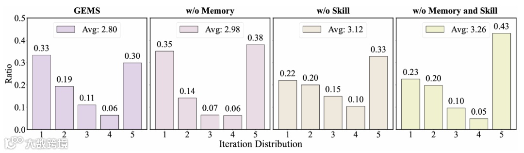 消融实验揭示Memory与Skill模块通过优化迭代质量,有效降低平均生图轮次。