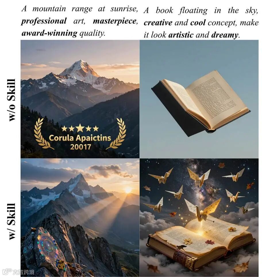 无技能:山脉写实但光影平淡;启用Aesthetic Drawing技能后,光影层次丰富,画面艺术感显著增强。