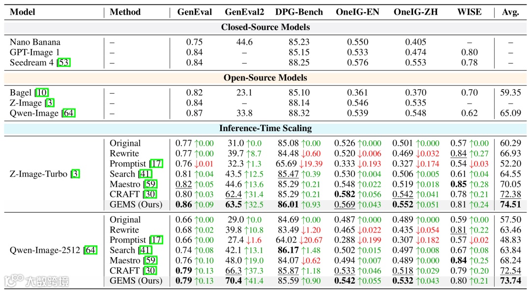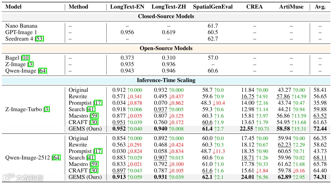基于Z-Image-Turbo,主流任务平均提升14.22%,下游任务超越最佳基线8.92%,充分验证GEMS框架有效性。
