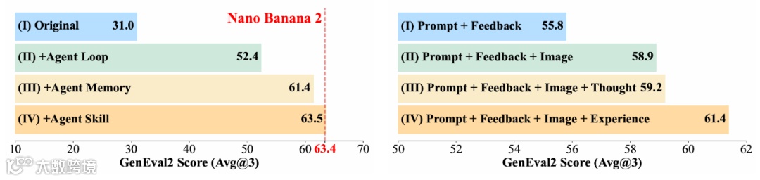 左图显示逐步集成Agent Loop、Agent Memory及Agent Skill后性能持续提升,6B的Z-Image-Turbo在GenEval2上成功超越Nano Banana 2;右图证实思维链压缩为经验的有效性。