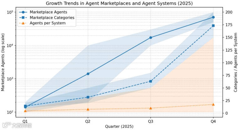 图1 2025年智能体市场与系统增长趋势(阴影区表示估计范围),数据来源:Internet Archive存档网页