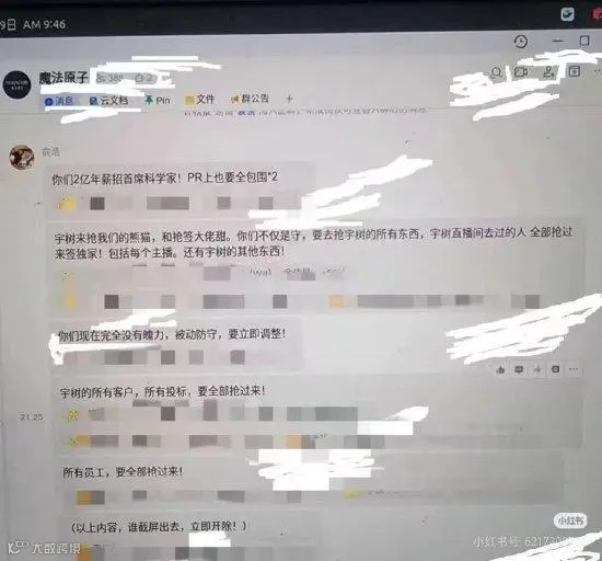 追觅科技创始人俞浩要求团队主动争夺竞争对手宇树科技的客户及员工,并表示将投入2亿年薪招募首席科学家。截图信息显示俞浩强调"要把宇树所有客户、标的抢过来",追觅方未证实消息。(新浪科技)