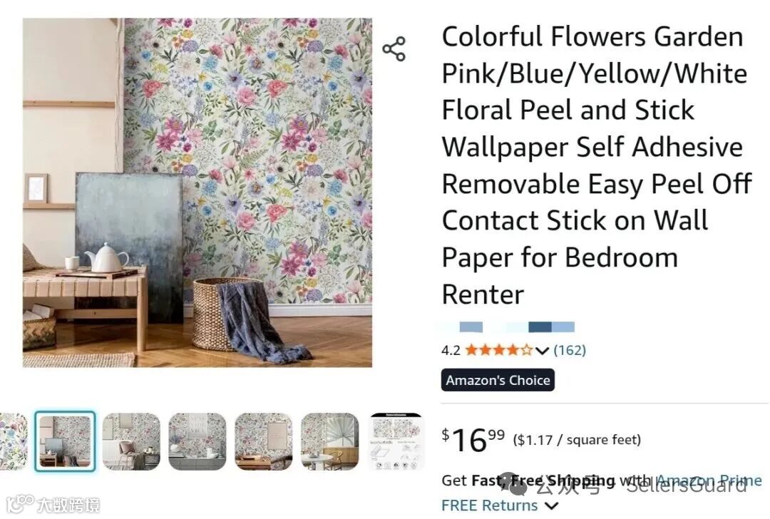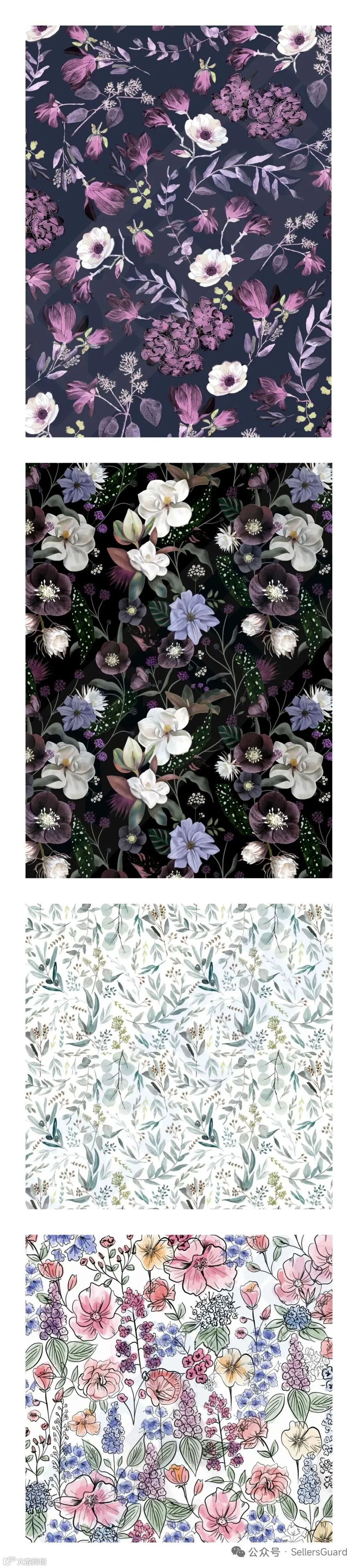 本案据称共起诉178家跨境店铺,以亚马逊、Etsy等平台为主,被告名单暂未公开。维权内容涉及4张花卉水彩版权图: