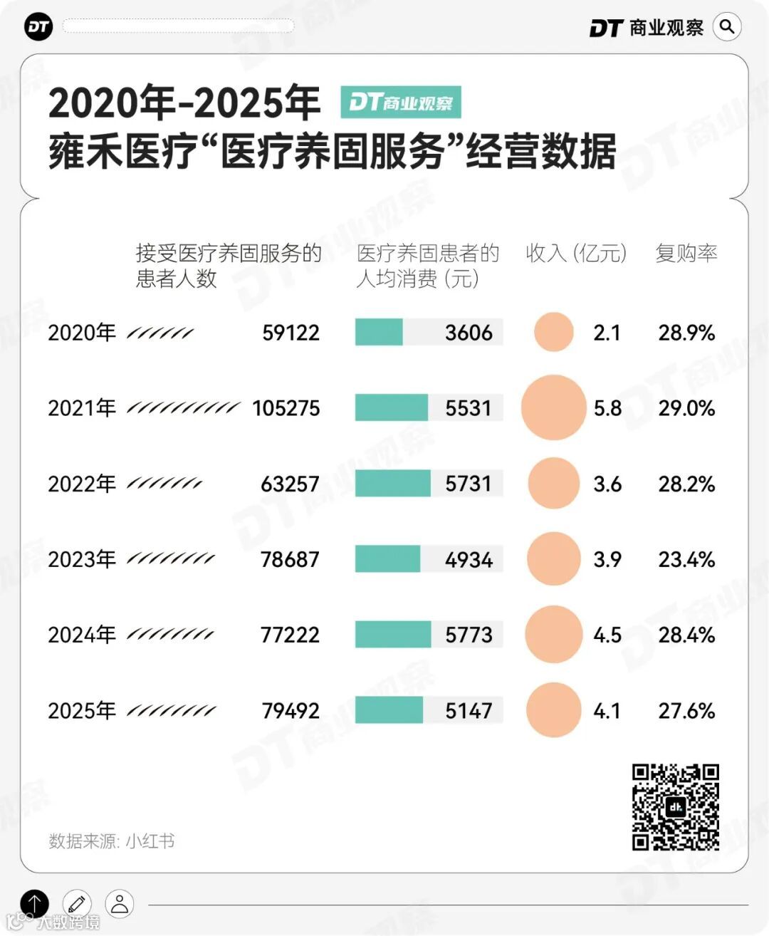 2025年,雍禾医疗的医疗养固业务消费人数为7.9万,虽然超过了植发消费人数的7.1万,但同比2024年只增加了约2000人,远低于同期植发新增的1万人。