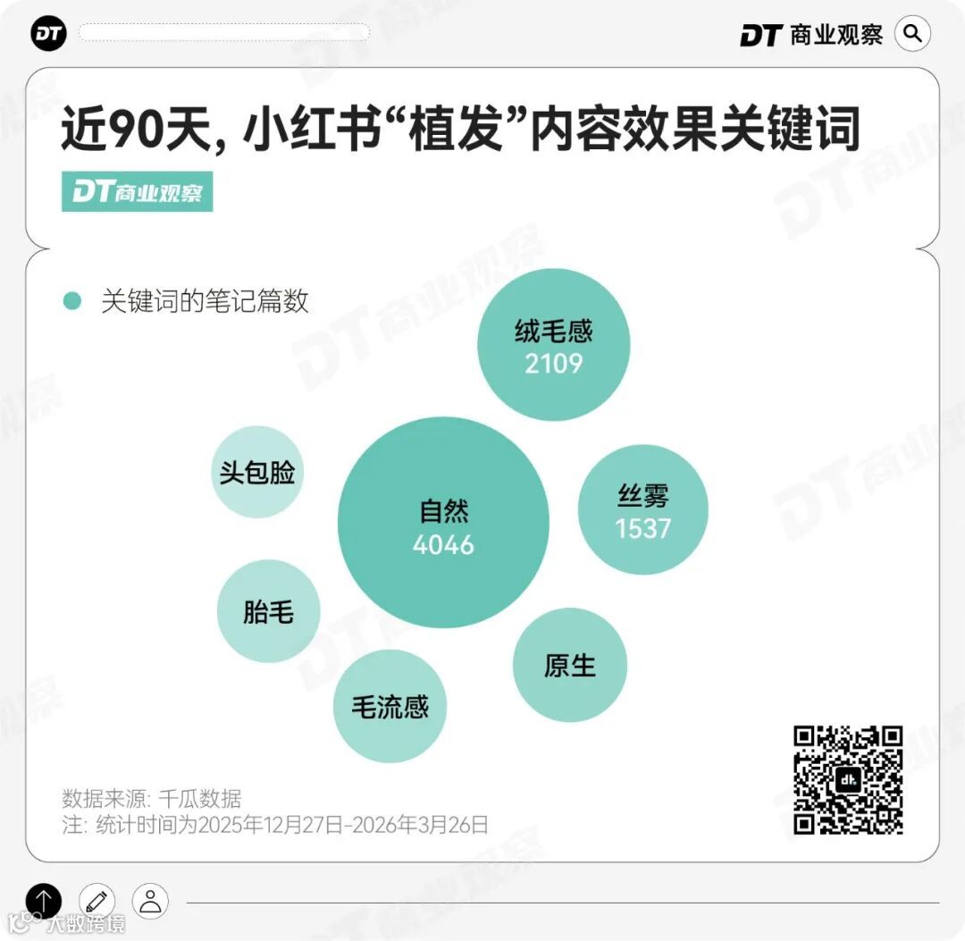 近3个月小红书植发相关内容中,"自然""绒毛感""丝雾""原生"等词高频出现,而"遮秃"一词并没有被提及。