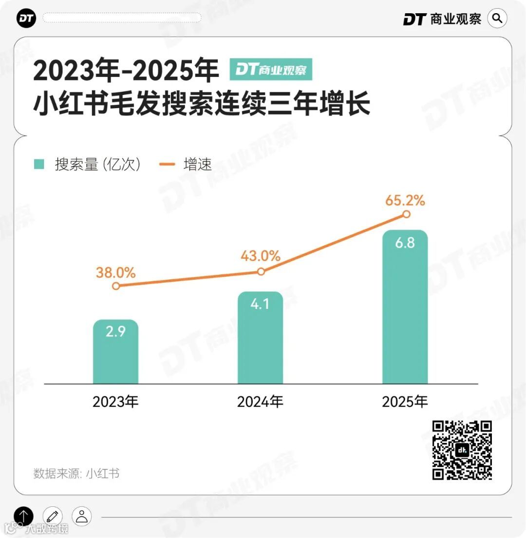 2025年,小红书毛发相关内容搜索增速达65%,已连续三年保持高增长。其中,"植发"成为一个高热度话题,植发真心话相关笔记量增长852%。