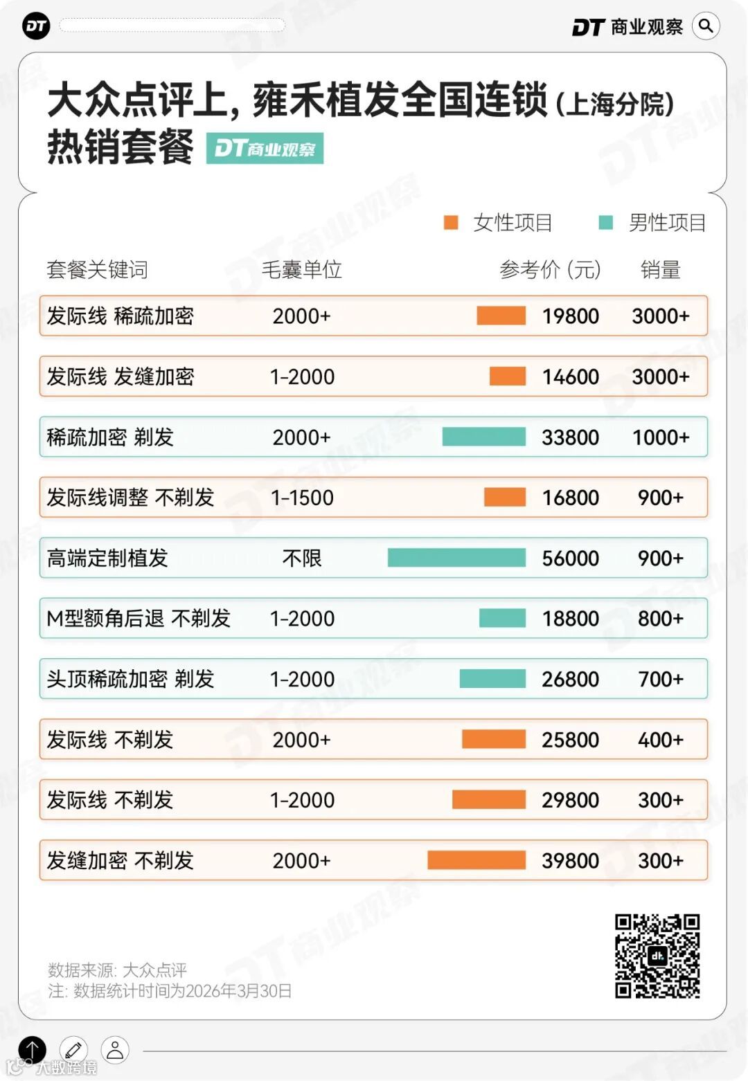 以2026年3月大众点评雍禾植发上海分院的数据为参考,目前店内销量TOP2套餐,均为针对女性的发际线植发项目,而且套餐价格都在2万元以内,低于同等毛囊单位下的男性植发套餐价格。(具体成交价格或有浮动,该价格可作市场参考)