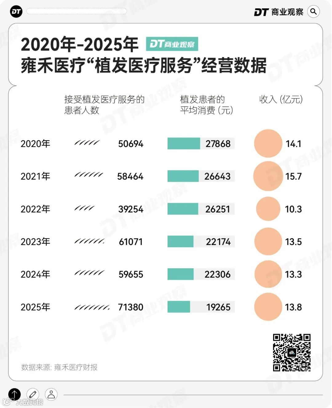 2025年,雍禾全年植发人数7.14万人,同比增长19.65%,但全年植发业务收入为13.75亿元,同比增长仅3.34%,背后是平均客单价同比下滑13.63%。