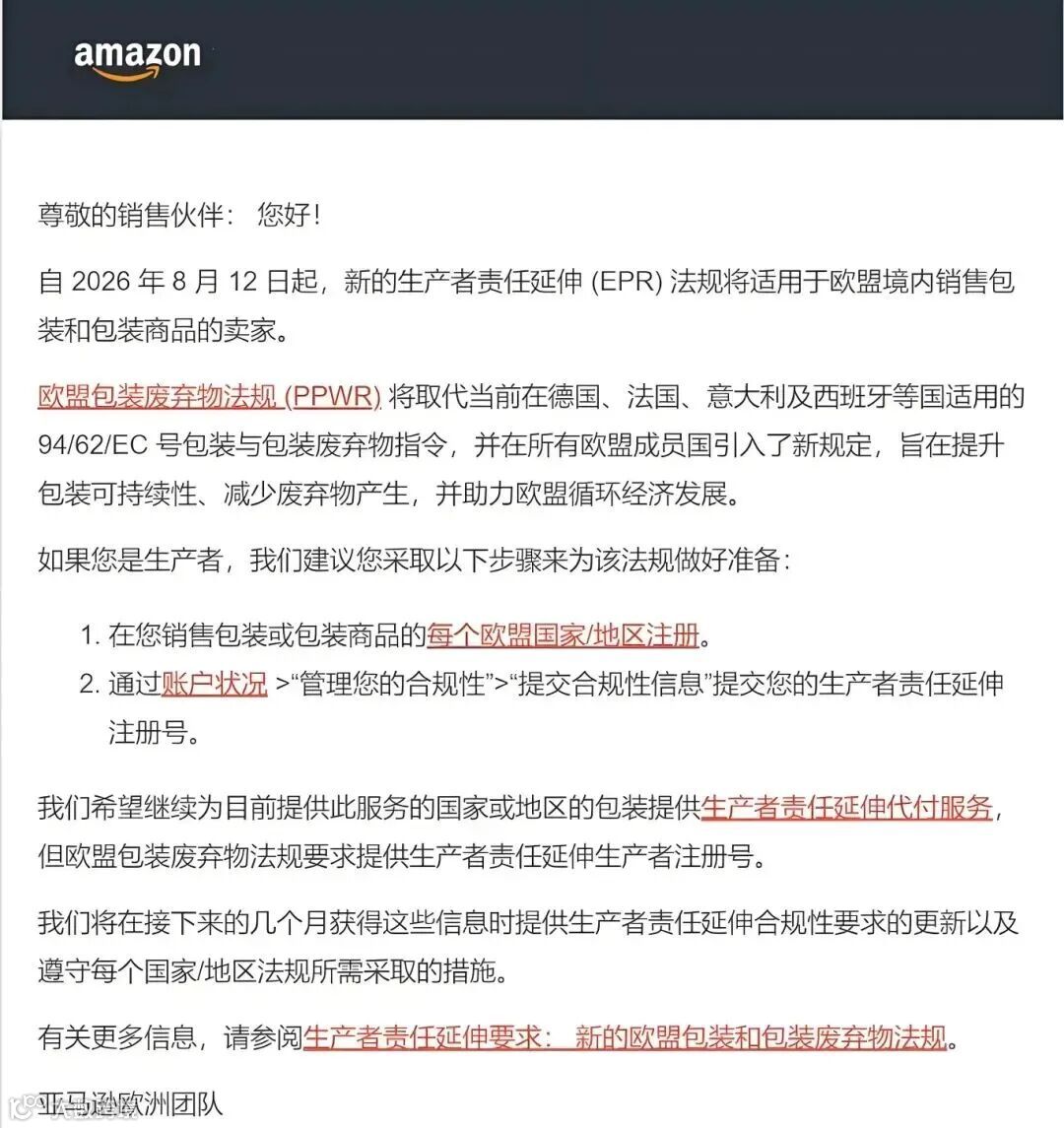 近日,不少卖家收到亚马逊官方提醒:欧盟包装和包装废弃物法规(PPWR)已正式进入执行倒计时。