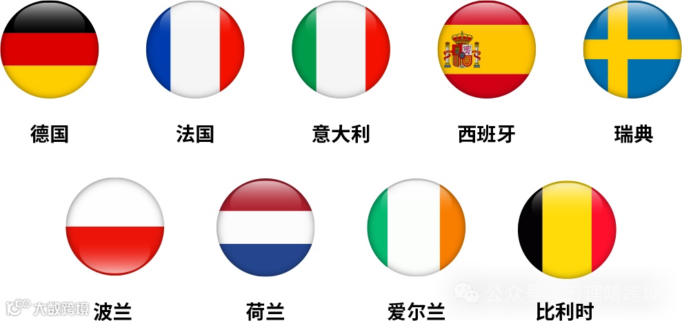 西欧/北欧: 德国、法国、比利时、荷兰、爱尔兰、瑞典