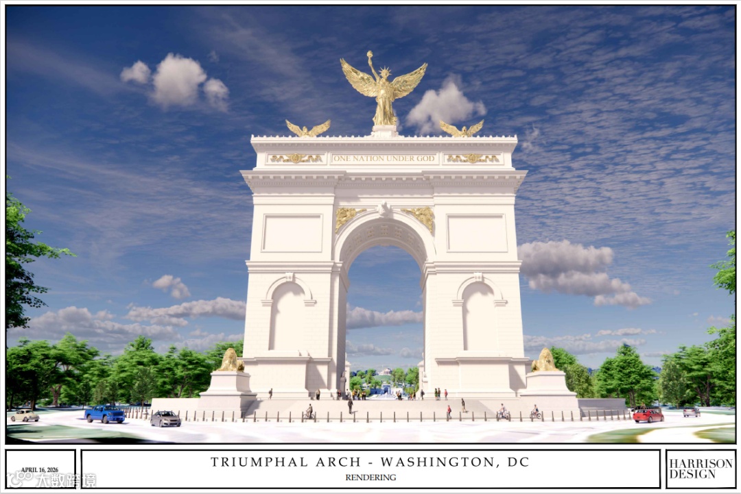 美国总统特朗普(Donald Trump)周五公布了其在首都修建新凯旋门的规划方案,其中包括一座高耸的翼状人物雕像,形象类似手持火炬、头戴王冠的“自由女神”(Lady Liberty),并由两只雄鹰(eagles)陪伴,四只雄狮(lions)守卫,整体均为镀金设计。