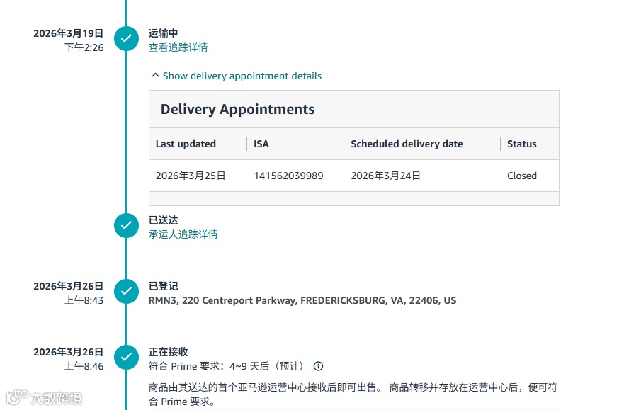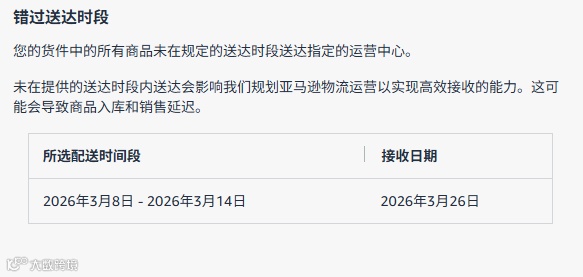 举个实际案例:您委托的物流货代公司预约了3月24日送仓,但亚马逊实际登记接收货件的时间为3月26日,而您在后台设置的送达时段为3月8日-3月14日,这种情况下就属于错过了规定的送达时段。