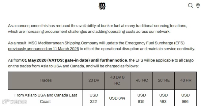 受中东局势及燃油市场供应变化影响,全球船用燃料价格持续走高。地中海航运宣布更新此前于3月发布的紧急燃油附加费政策,新标准自5月1日(以抵港时间为准)起正式实施,适用于亚洲出口至美国及加拿大的所有货物,直至另行通知。