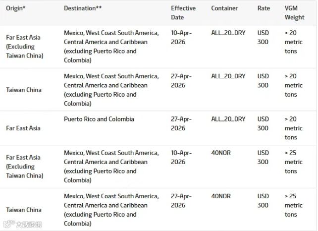 此外,马士基对远东至拉美航线新增超重附加费,超重集装箱每箱加收300美元,分两批次于4月10日及4月27日实施。