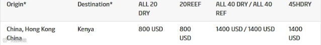 针对中国(含香港)至肯尼亚及坦桑尼亚达累斯萨拉姆航线,马士基自4月13日起征收旺季附加费。其中,至肯尼亚方向20尺柜800美元、40尺柜及45尺柜1400美元;至达累斯萨拉姆方向20尺柜300美元、40尺柜及45尺柜600美元,冷藏箱与干箱标准一致。