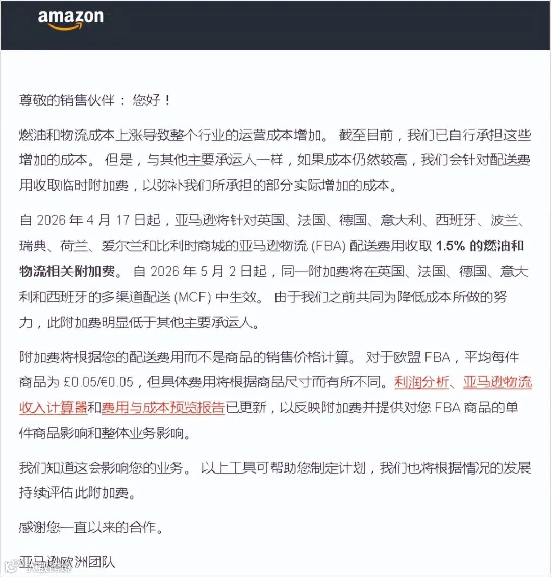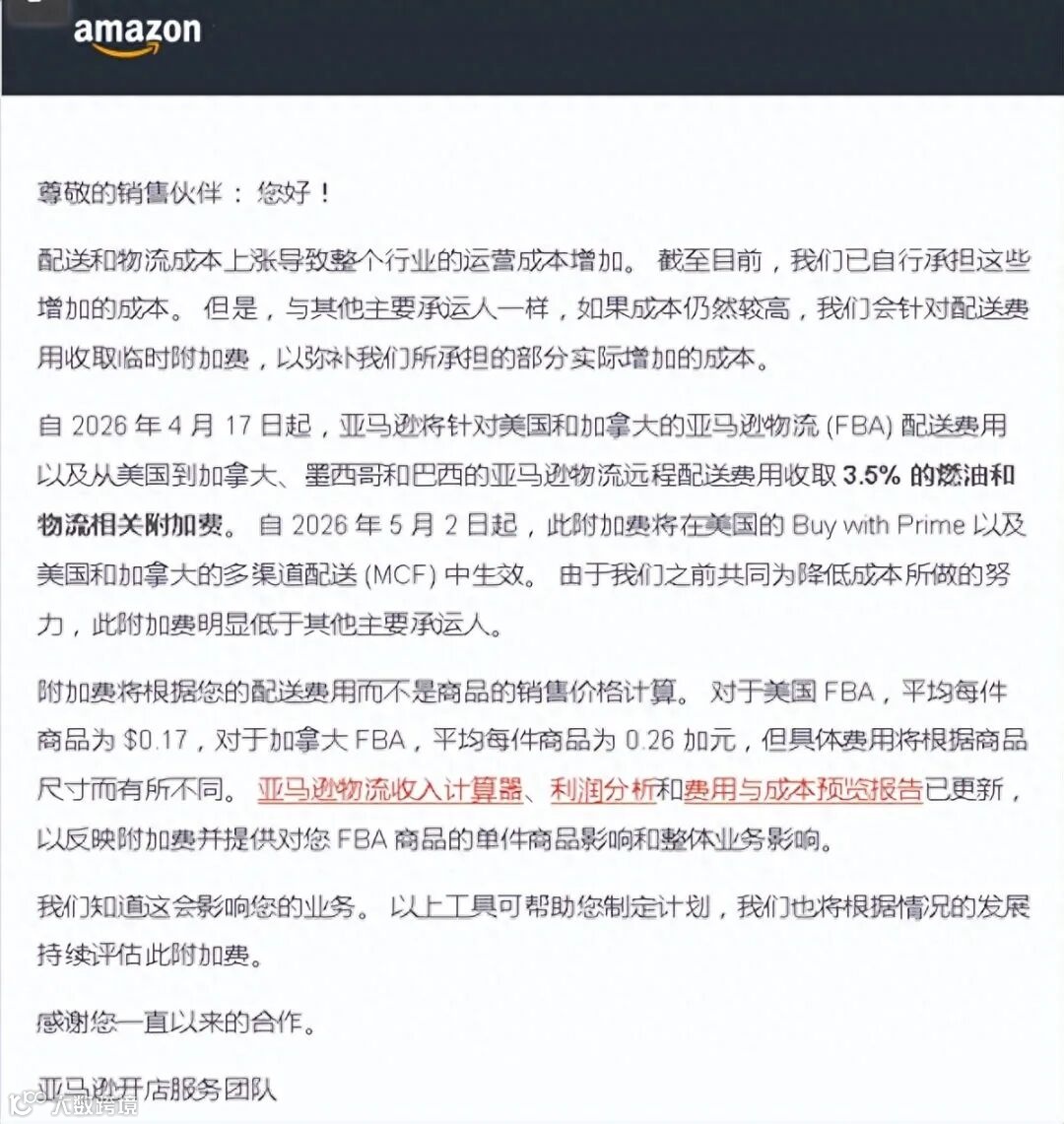 根据亚马逊公告,自 2026年4月17日 起,亚马逊将对美国、加拿大 FBA,以及美国发往加拿大、墨西哥、巴西的 Remote Fulfillment with FBA 加收 3.5% 的燃油附加费。