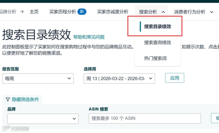 真正精准的抓取路径在后台:进入品牌分析报告,找到搜索目录绩效.
