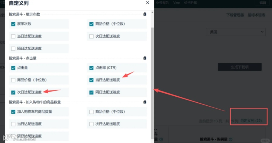 在自定义列中,手动勾选「当日达配送速度」和「次日达配送速度」.