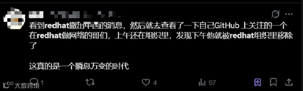 在每天人声鼎沸的 AI 声浪中,一条突发消息让我们恍惚了一下: 红帽(Red Hat)宣布停止在中国的全部工程活动,仅保留销售和支持职能,裁撤 419 名研发员工,雇佣关系统一于 2026 年 7 月 31 日终止,赔偿方案 N+3 至 N+6,研发职能将转移至亚太地区其他工程枢纽。