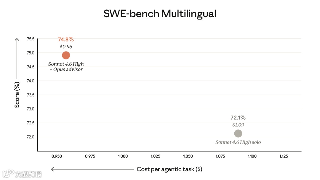 如果你还不放心,可以看看官方内部测测评,Sonnet + Opus 顾问的组合,比单跑 Sonnet 在 SWE-bench 多语言测试上高出 2.7 个百分点,成本还少了 11.9%。