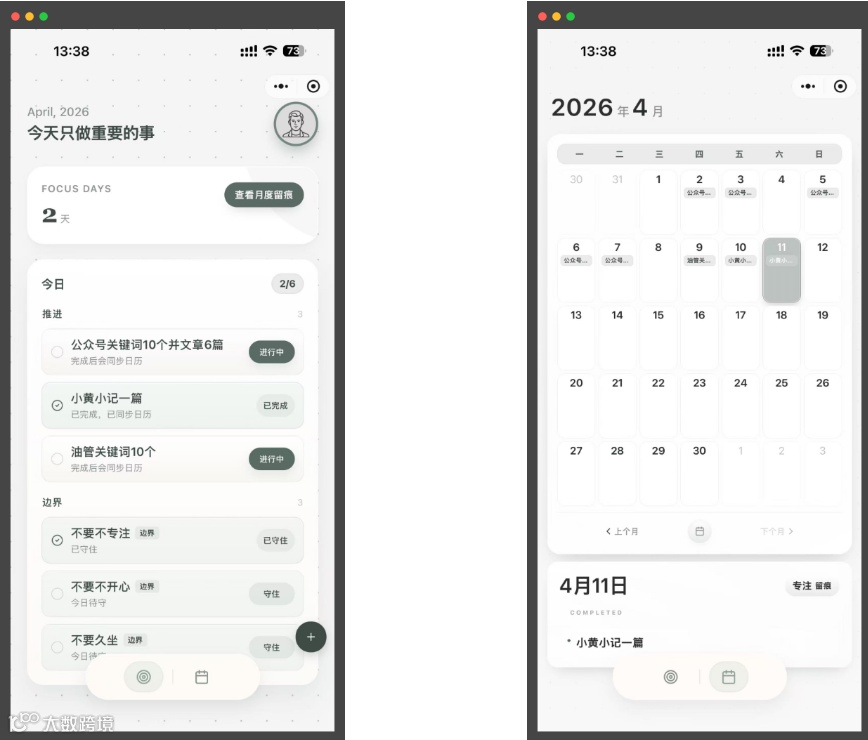 上线了4个,有一个是根据自己需求做的,如图,其实就是聚焦一些事情,摒除一些事情的日历!虽然朋友们给了建议,最后还是回到更简单的功能,我改了,但又改回来了哈哈,谢谢各位~
