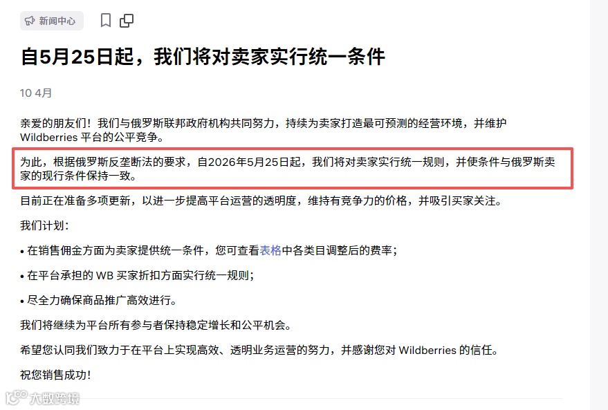 Wildberries 正式发布公告,自 2026 年 5 月 25 日起,对所有卖家实行统一运营条件,中国跨境卖家与俄罗斯本土卖家规则完全对齐。