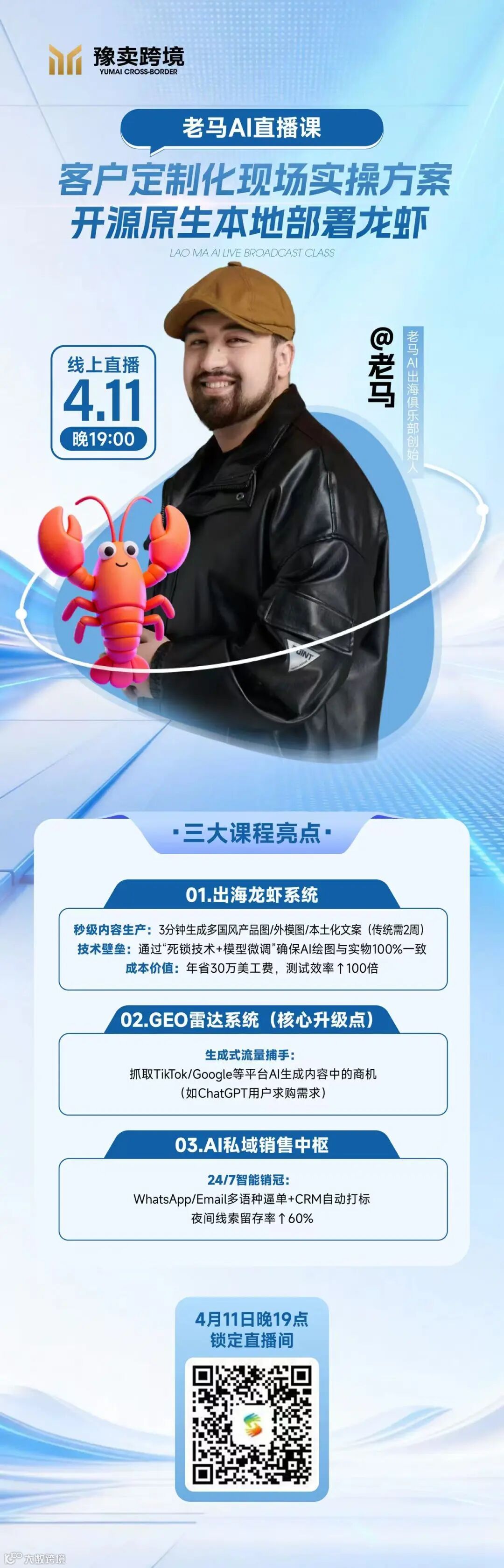 课程核心价值聚焦三大方向:3分钟快速生成产品图文内容,显著降低美工成本;GEO雷达技术精准抓取全平台商机,提升获客效率;24小时AI自动化跟进系统实现线索留存率提升60%。现场将开放龙虾系统开源本地部署实操教学。