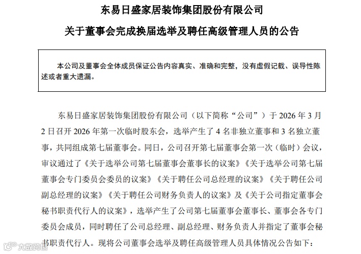 3月2日,东易日盛(002713.SZ)完成董事会换届,创始人陈辉任期届满离任,标志29年掌舵结束。新任董事长兼总经理张建华持股15.77%,同时兼任实控人与董事会秘书,开启"家装+算力"战略新周期。