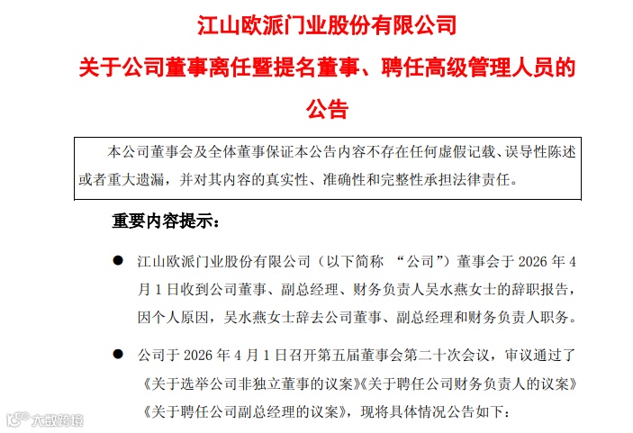 4月1日,江山欧派(603208.SH)公告副总经理兼财务负责人吴水燕辞职。同日董事会聘任赖晨露、周庆君等三位"80后"担任新职,管理团队全面年轻化。
