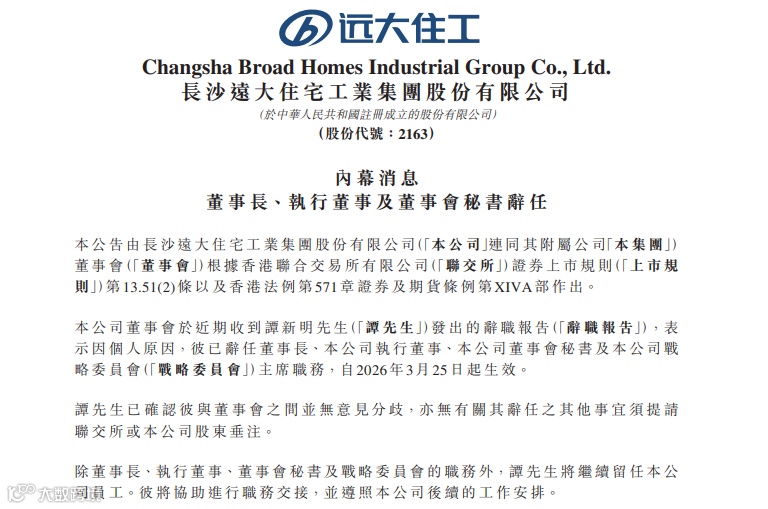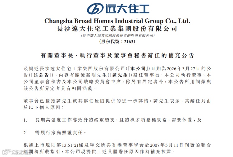3月25日,远大住工(02163.HK)公告董事长谭新明因长期高强度工作致身体严重透支辞职。4月2日补充说明其需休养及履行家庭照护责任。此前财务负责人唐芬已于3月10日离职,双重变动考验企业治理稳定性。
