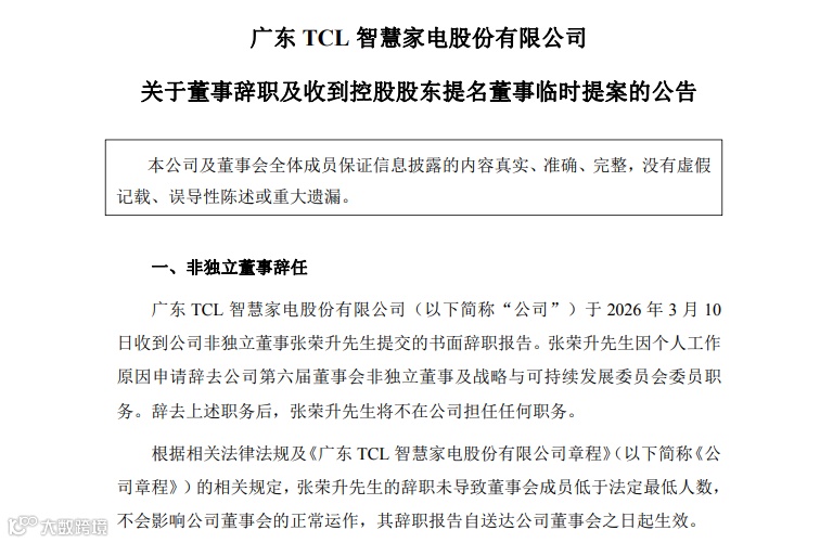 3月10日,TCL智家(002668.SZ)称非独立董事张荣升因工作原因辞职。其金融领域背景的接任者宋红海(北京大学经济学硕士、CFA持证人)获提名,强化资本运作能力。