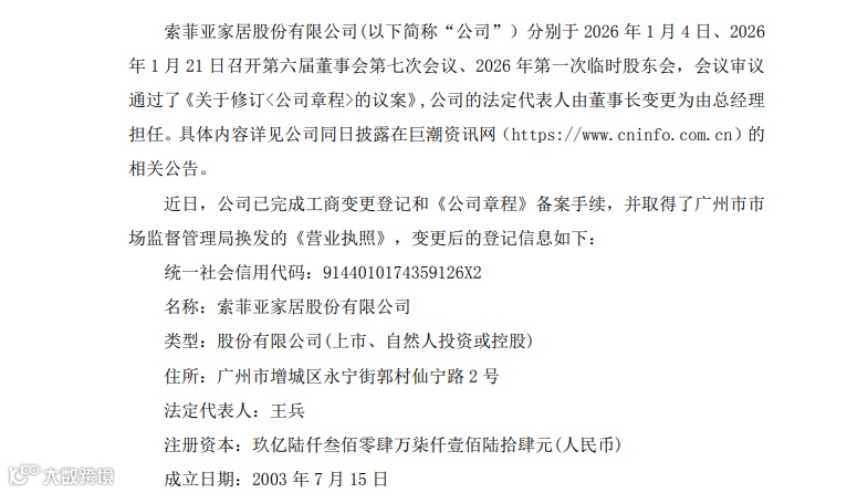 3月20日,索菲亚(002572.SZ)完成工商变更,法定代表人由董事长江淦钧变更为总经理王兵。调整后江淦钧专注战略规划,王兵直接负责日常经营,提升决策效率,非控制权变更。