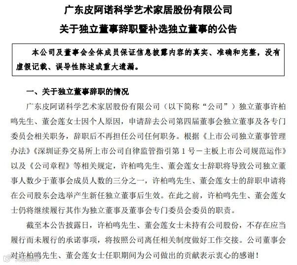 3月4日,皮阿诺(002853.SZ)公告独立董事许柏鸣、董会莲因个人原因辞职。董事会同步提名刘孟涛、顾晓光为新任独立董事候选人,加速治理团队优化。