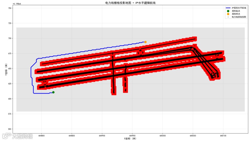 针对电力线间距窄、跨度大的特点,创新构建栅格化障碍地图,通过投影膨胀技术生成安全缓冲区域,彻底解决碰撞检测漏检问题,保障无人机全程安全飞行。
