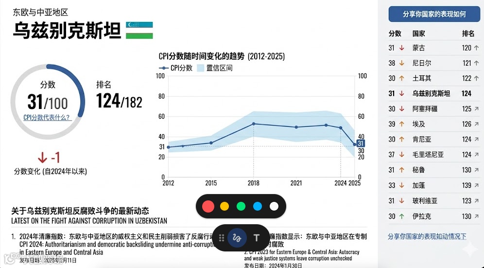 乌兹别克斯坦强推全领域现金限制,宣称要压缩影子经济。然而,其2025年腐败感知指数(CPI)仅31分(全球排名124/182),连续两年下滑,暴露制度漏洞:记者反腐败仍遭压制,司法独立性薄弱。这对中资企业构成严峻考验——依赖现金的小微企业将面临合规成本飙升及经营中断,而政策朝令夕改的传统(如频繁调整税务与签证规则)加剧了预期不稳定性。