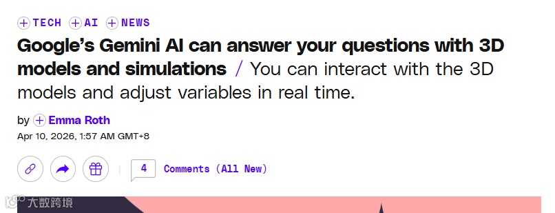 4月11日,据The Verge报道,谷歌Gemini完成升级,可基于用户问题实时生成交互式3D模型。