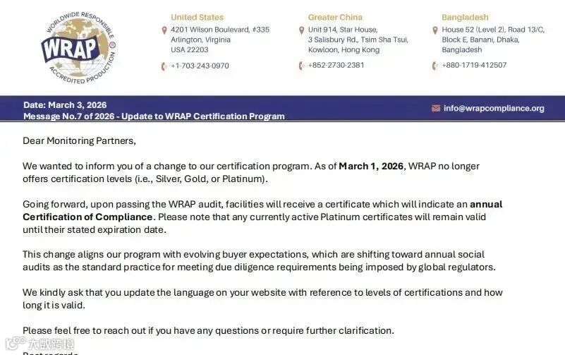 WRAP(环球服装生产社会责任组织)近期宣布政策调整:自2026年3月1日起,取消金、铂金、银等级认证,转为年度符合性证书。新证书基于审核报告评估工厂社会责任合规计划的广度与稳定性,以及管理层对WRAP 12项原则的承诺,有效期一年。现有有效期内的铂金证书可正常使用至到期日。