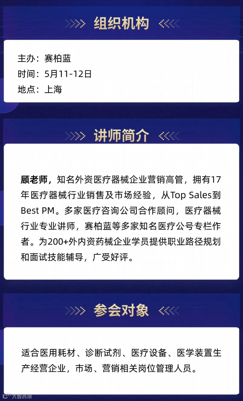 赛柏蓝将于5月11-12日在上海举办本次特训营,聚焦数据驱动与价值医疗两大核心趋势,系统提升四大关键能力:客户管理(融合人格魅力与学术投入)、学术活动(强化温度传播与精准转化闭环)、渠道商体系(构建战略招募与战术培养机制)、区域市场(深化数据洞察与科学决策应用)。
