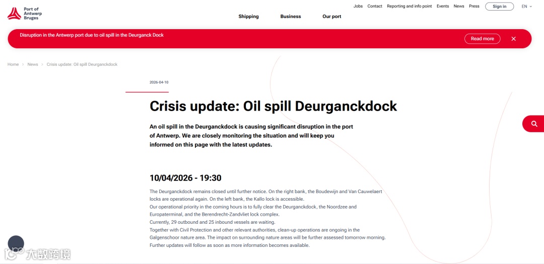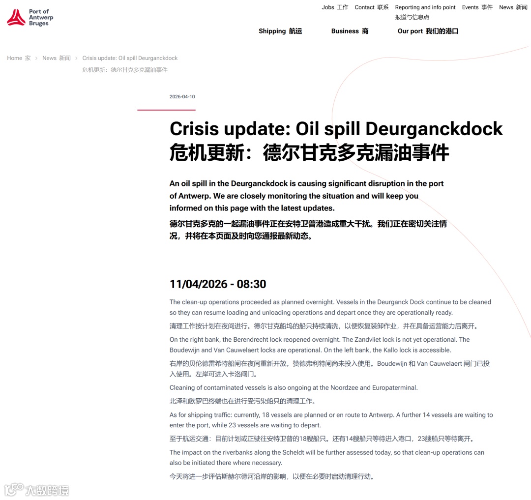 4月10日,欧洲最大港口安特卫普-布鲁日港Deurganckdok集装箱码头发生重大漏油事故,紧急停摆。事故源于船舶加油过程,油污迅速扩散至斯海尔德河,演变为影响航道、船闸及周边自然区域的系统性危机。