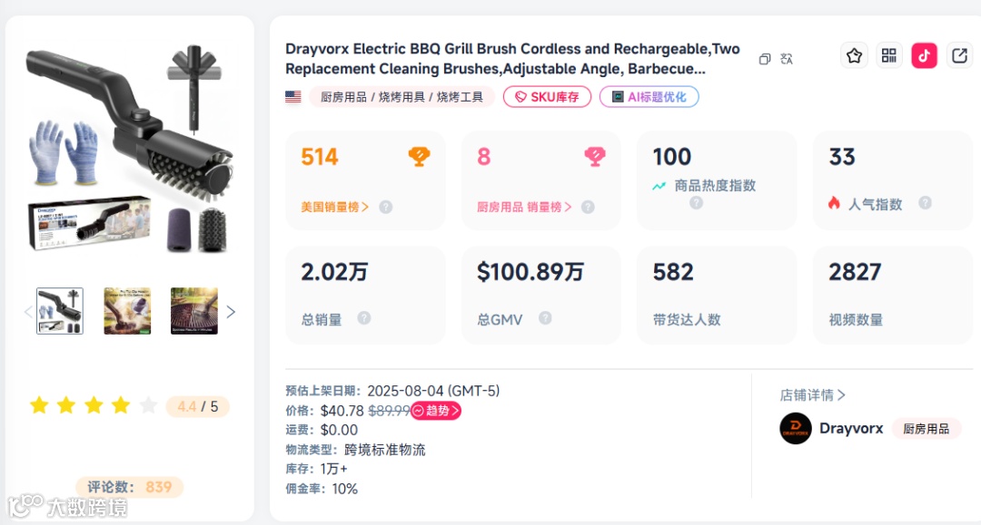 中国品牌Drayvorx电动烤架刷自去年8月登陆TikTok美区,定价40.78美元(约合278.65元)。近28天售出6617件,销售额超262万元;累计销量达2.02万单,销售额100.89万美元。