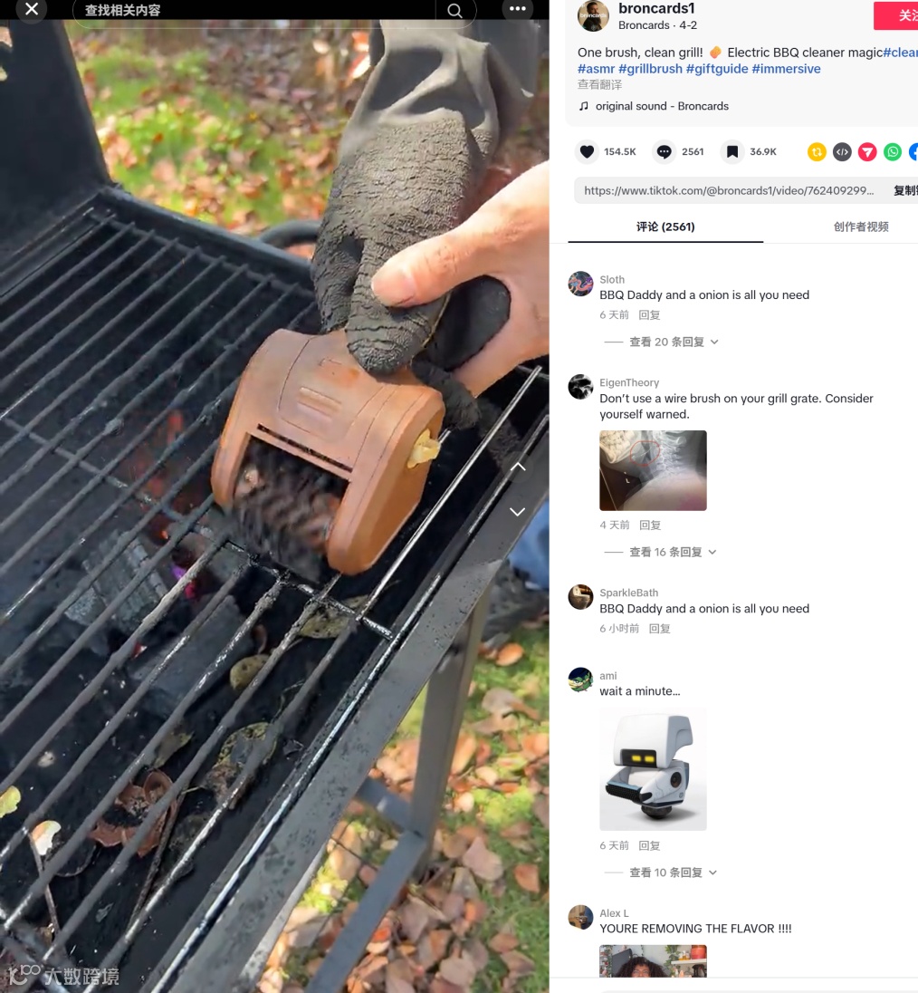 随着户外烧烤需求升温,清洁烤架难题成为家庭聚会痛点。TikTok平台"#grillcleaning"话题及相关搜索量显著增长,一条19秒清洁视频单周播放量即破1410万次,预示烧烤清洁工具即将成为美区厨房用品新热点。