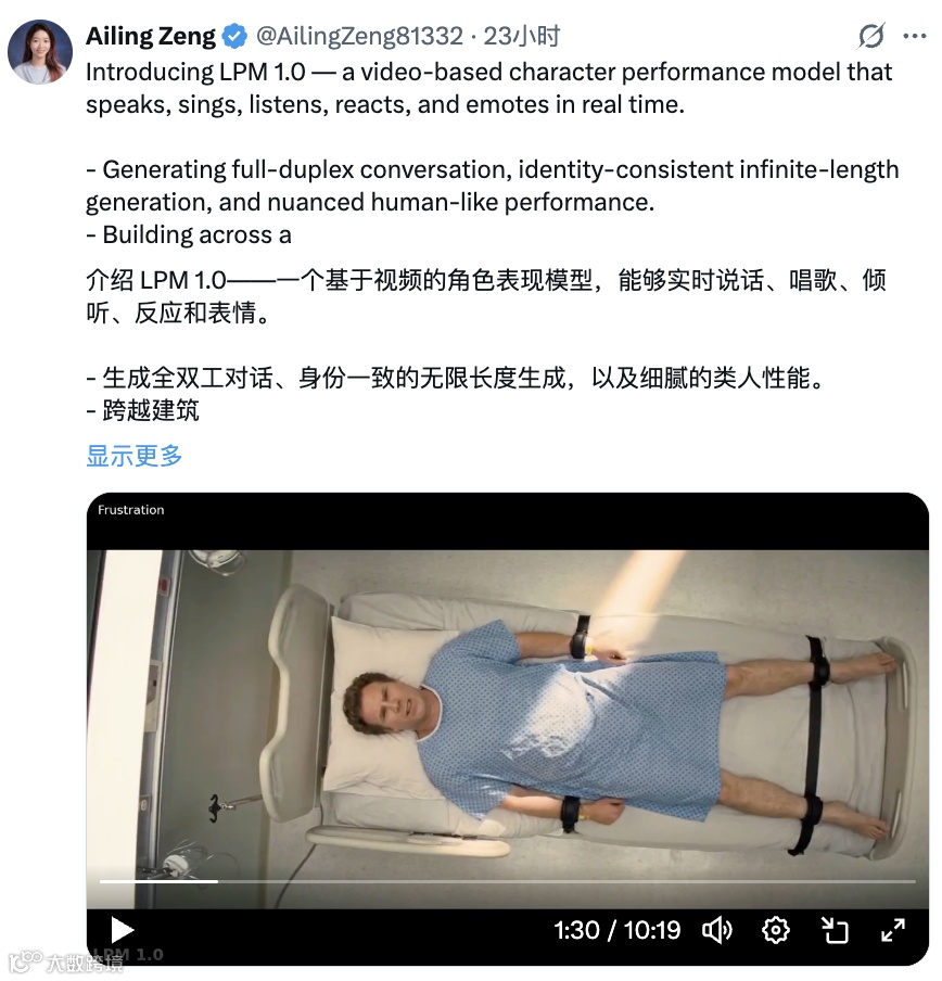 在LPM 1.0中,AI角色不仅能演绎情绪,还具备听觉反馈能力。