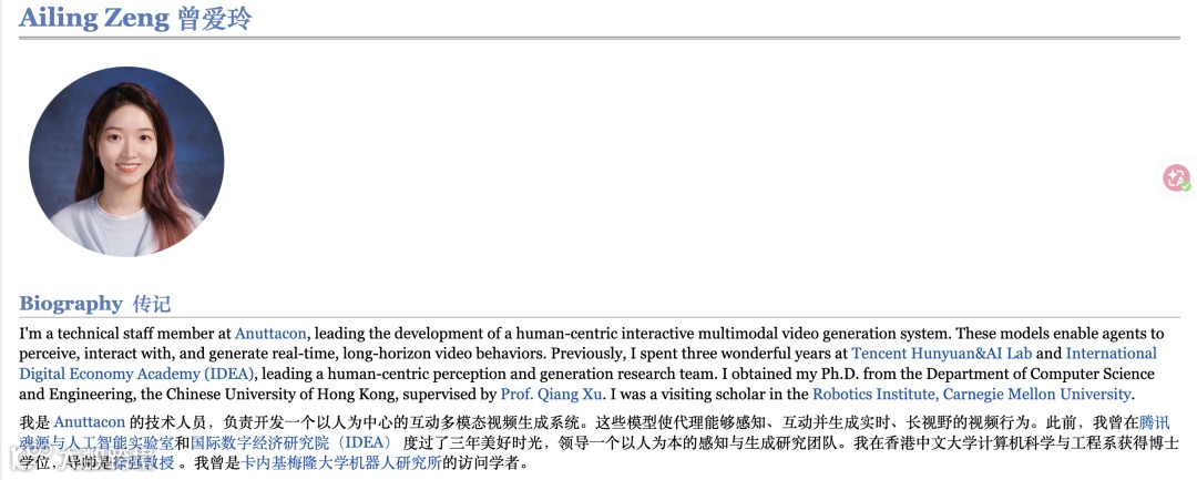 技术团队由多领域专家组成。Ailing Zeng博士毕业于香港中文大学,曾任腾讯混元团队及IDEA研究院研究员,主导互动多模态视频生成研究。
