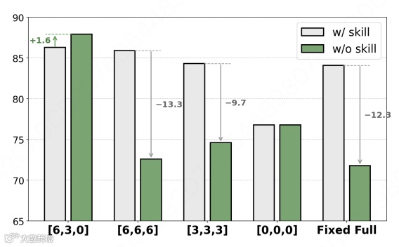 消融实验关键发现:训练全程满技能[6,6,6]会导致推理撤技能后性能暴跌12.3点;而渐进课程[6,3,0]反使性能提升1.6点。动态课程机制至关重要——移除过滤性能降2.7%,随机选技能则大跌13.7%。