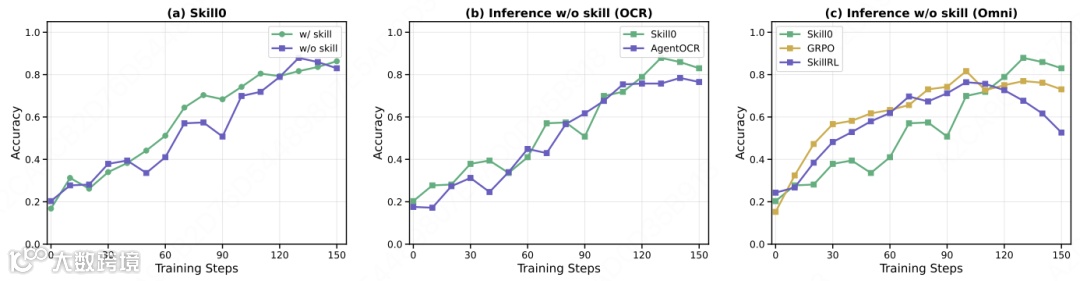 训练曲线证实技能内化:初期带技能模型占优,但SKILL0随训练推进持续反超,最终稳定领先。