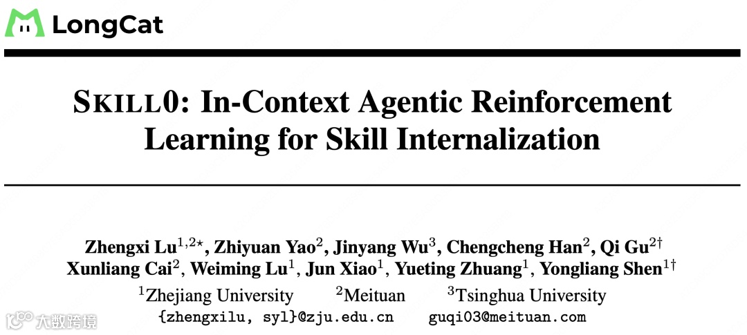 浙大、美团龙猫团队与清华大学推出SKILL0,提出技能内化(Skill Internalization)理念:小模型应将技能内化为参数本能,而非依赖推理时外部调用。