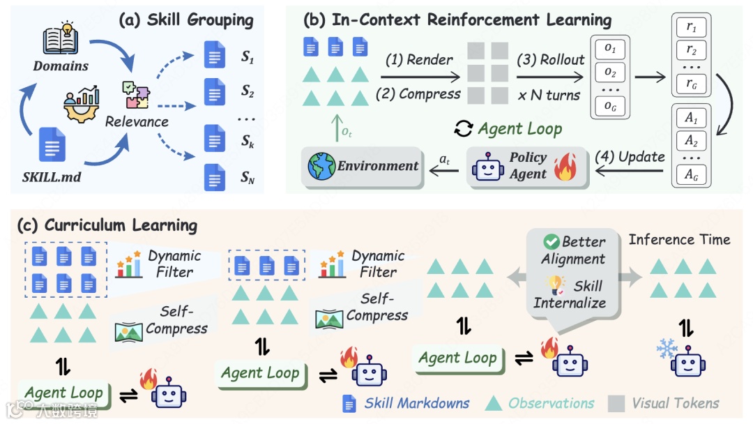 图2:SKILL0框架全景。(a)相关性驱动技能分组;(b)带技能的Agent训练循环;(c)训练动态课程。