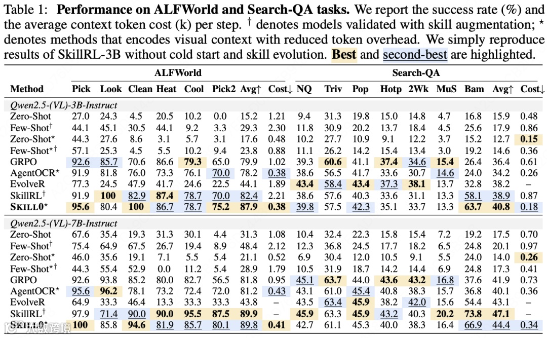 ALFWorld任务:3B模型SKILL0平均成功率87.9%,较基线高9.7%,优于带技能SkillRL(82.4%)