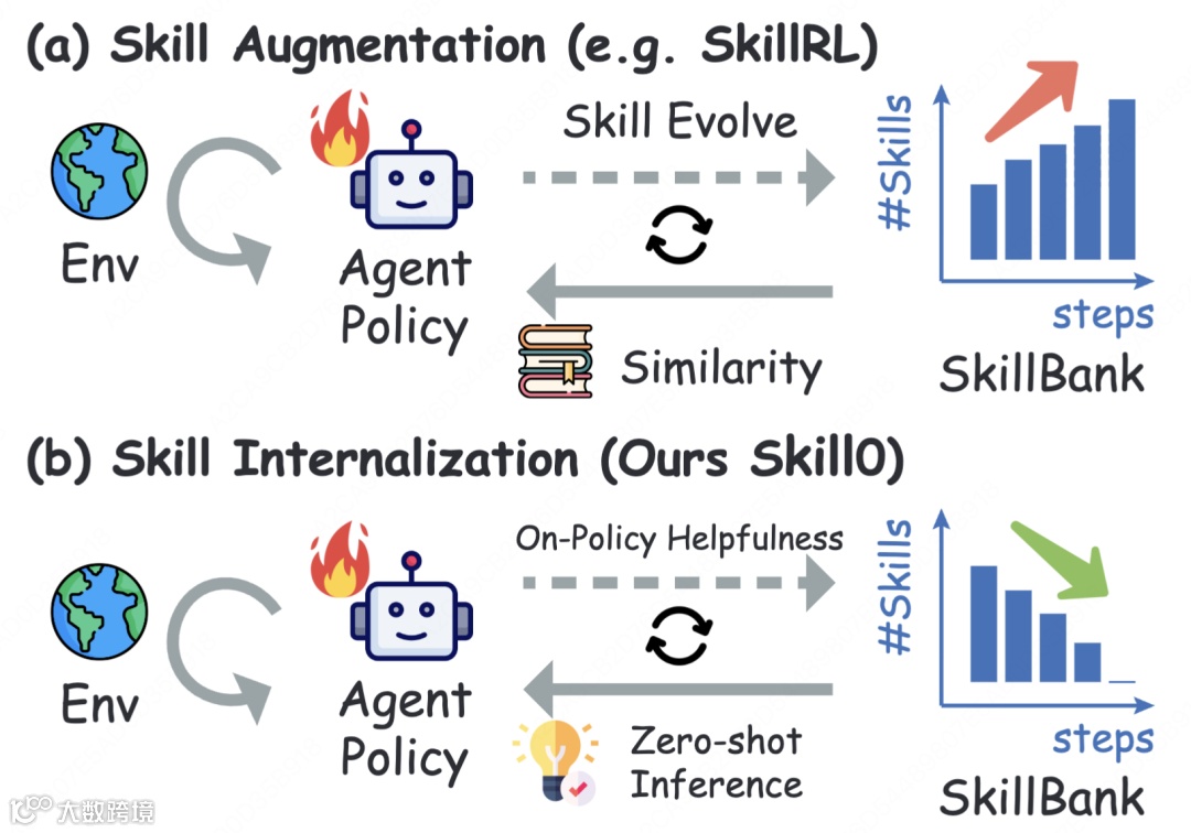 △ 技能增强(左)vs技能内化(右)。传统方案需实时检索技能文档;SKILL0训练时用技能,推理时完全自主。